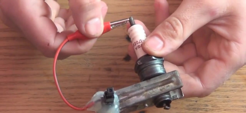 Схожий по принципу работы прибор можно соорудить своими руками из обычной пьезо-зажигалки. Проводок, идущий от пьезо-модуля, удлиняется и прикрепляется к наконечнику снятой свечи зажигания. Непосредственно блок нужно прижать к корпусу свечи и нажать на нём кнопку. Если искра не проскочила, тогда свечу нужно менять.