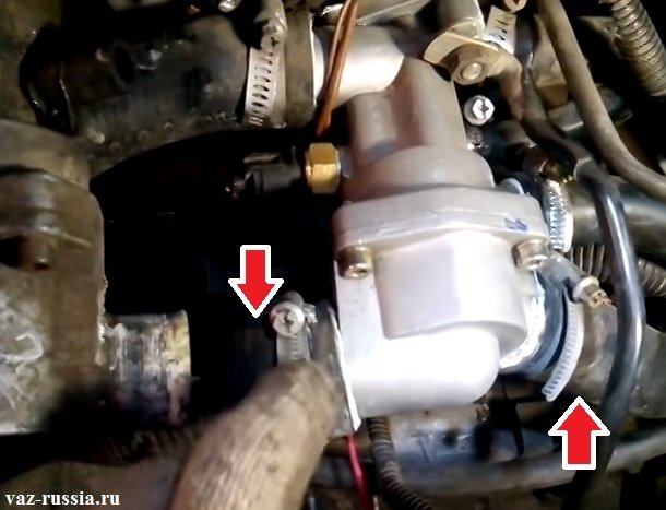 - Теперь найдите подводящий шланг трубы помпы и шланг, служащий в качестве соединения термостата и выпускного патрубка. Снова ослабьте хомуты.