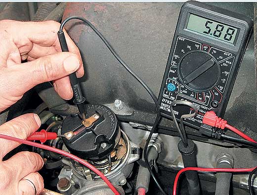 Провода отсоединяются от разрядника и полностью снимаются с двигателя. Для этого используется тестер в режиме измерения сопротивления в диапазоне 20 кОм. Контакты тестера помещаются с двух сторон провода и снимаются показания.