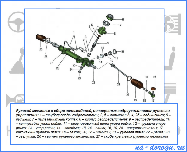 Устройство гидроусилителя руля имеет в своем составе следующие элементы: