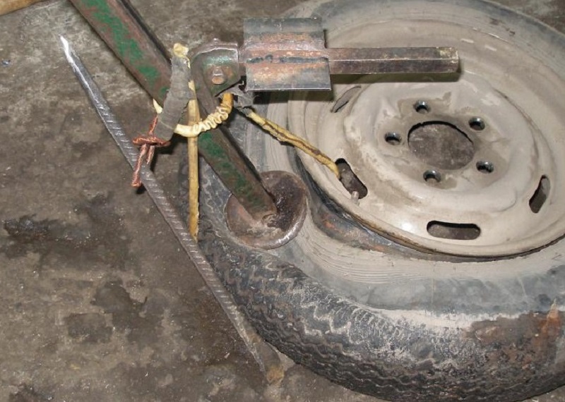 Ещё вариант, как самому разбортировать бескамерное колесо при помощи реечного домкрата. Привязываем край подъёмной площадки к диску проволокой или тросом, а его пятку упираем в шину. Поднимаем диск. В процессе работы, постепенно перемещаем домкрат по периметру шины. Однако, такой вариант опасен. Если порвётся соединение, то конструкция разлетится.