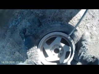 После отделения бортов покрышки автомобиля от диска нужно было встать на нее и работать монтировками (переставляя их поочередно). Так постепенно из диска выводилась сначала одна сторона, затем другая.