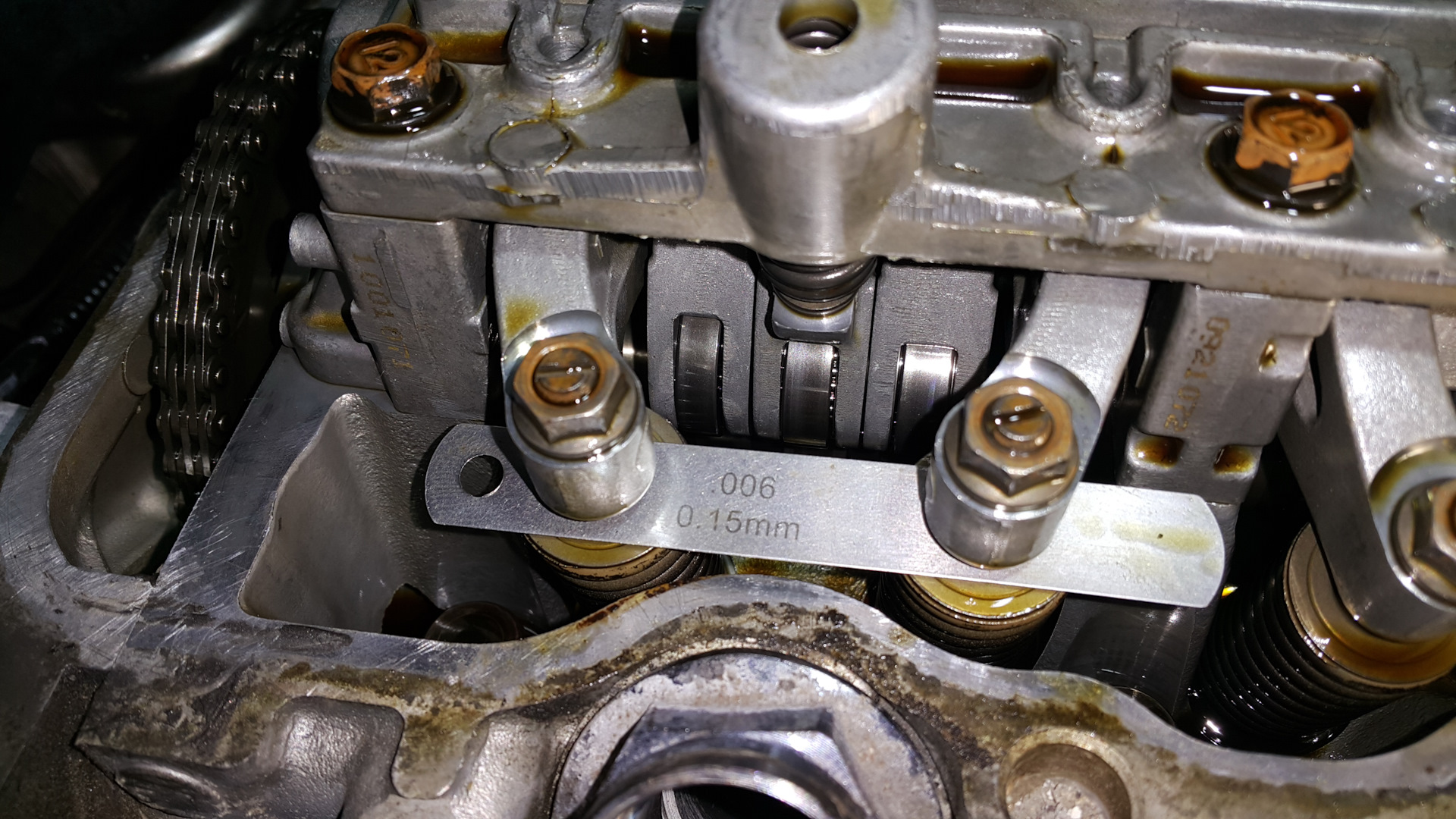 Чтобы отрегулировать клапана Сузуки мастер снимает катушки зажигания и откручивает парубки системы охлаждения. Затем выкручиваются болты и демонтируется клапанная крышка. Регулировка проводится при помощи щупа и подбора специальной шайбы. На впускных клапанах положено выставлять зазор 0.18 — 0.22. На выпускных ставится промежуток в 0.28 — 0.32.