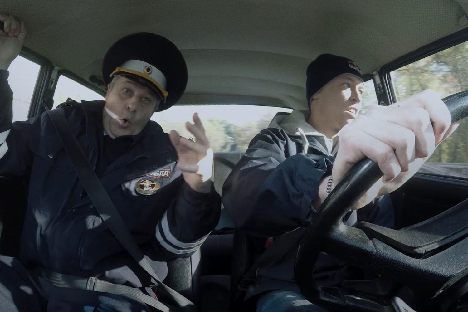 садится инспектор ГИБДД. Несколько других экзаменующихся занимают пассажирские