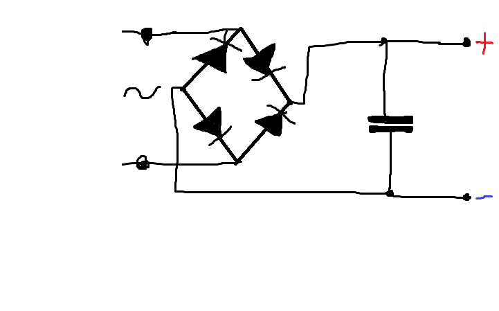 Ищем подходящие диоды по даташитам (техническим описаниям на радиоэлементы). Вставляем конденсатор с приличной емкостью. Его подбираем исходя из того, чтобы постоянное напряжение на нем не превышало то, которое написано на его маркировке. Простейший источник постоянного напряжения готов к использованию!