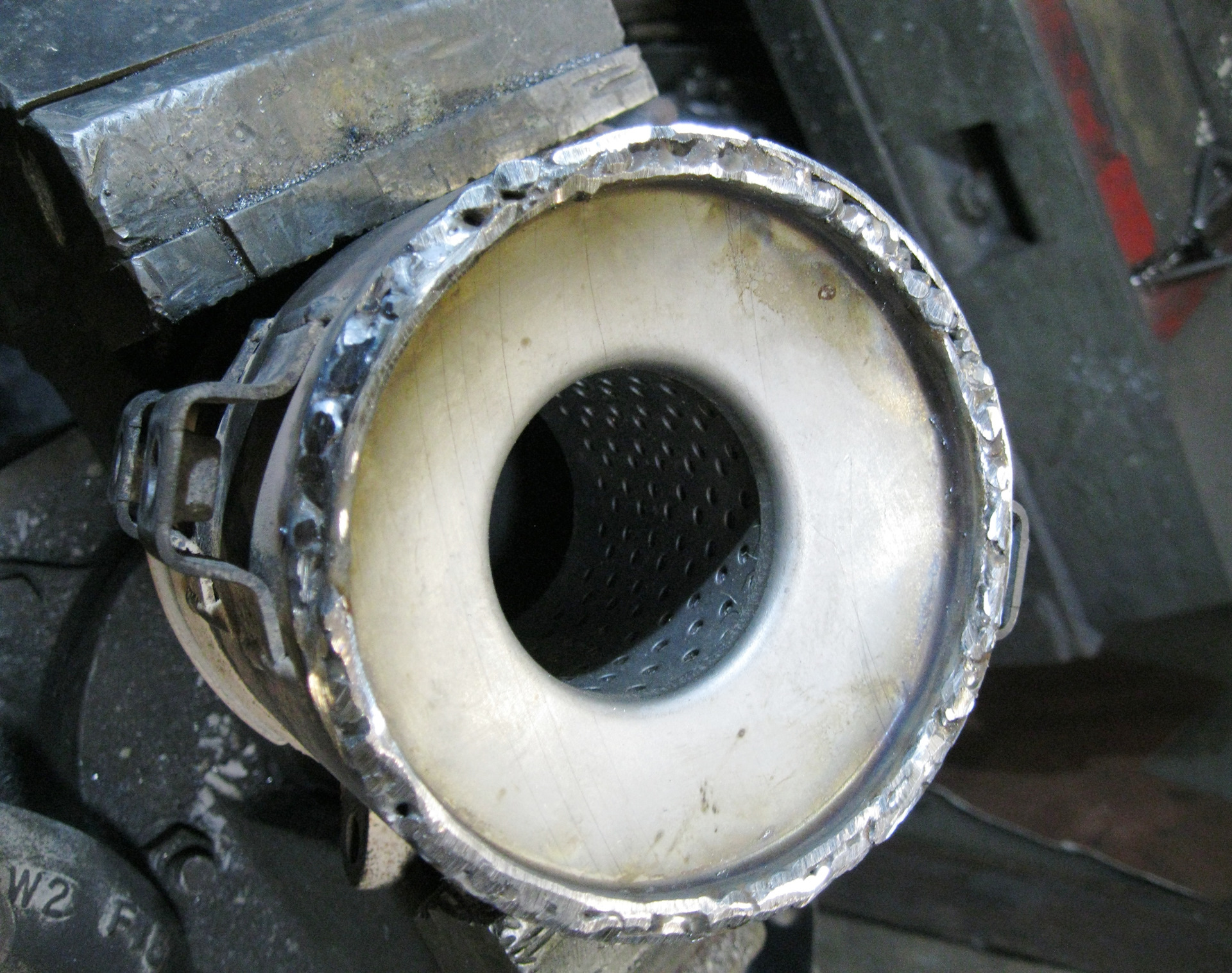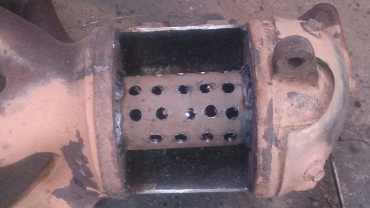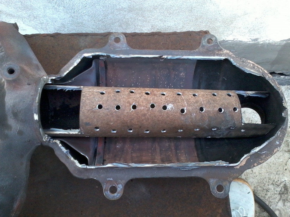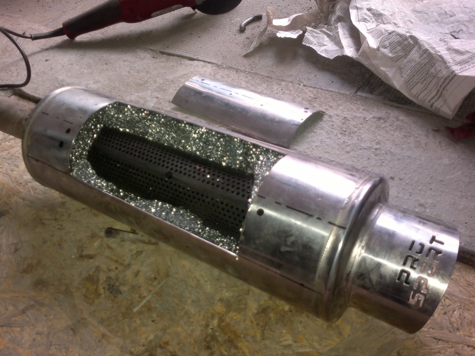 Сначала придётся демонтировать глушитель, так как необходимо удалить неисправный катализатор. Именно с размерами этого элемента должны совпадать параметры меньшей трубы. Вторая труба будет на 5 — 6 см короче и на каждой её оконечности необходимо сделать надрезы. На трубе меньшего диаметра предстоит сделать отверстия диаметром около 3 мм. Когда она будет перфорирована, поверхность необходимо зачистить щёткой и вставить в большую строго по центру. Затем нужно загнуть её по предварительно сделанным надрезам и заварить. При этом необходимо убедиться в герметичности швов. Развернув трубы открытой стороной вверх, на меньшую следует надеть ёршики и плотно утрамбовывать их в этой своеобразной ёмкости. Остаётся лишь загнуть лепестки к трубе малого диаметра и приварить их.