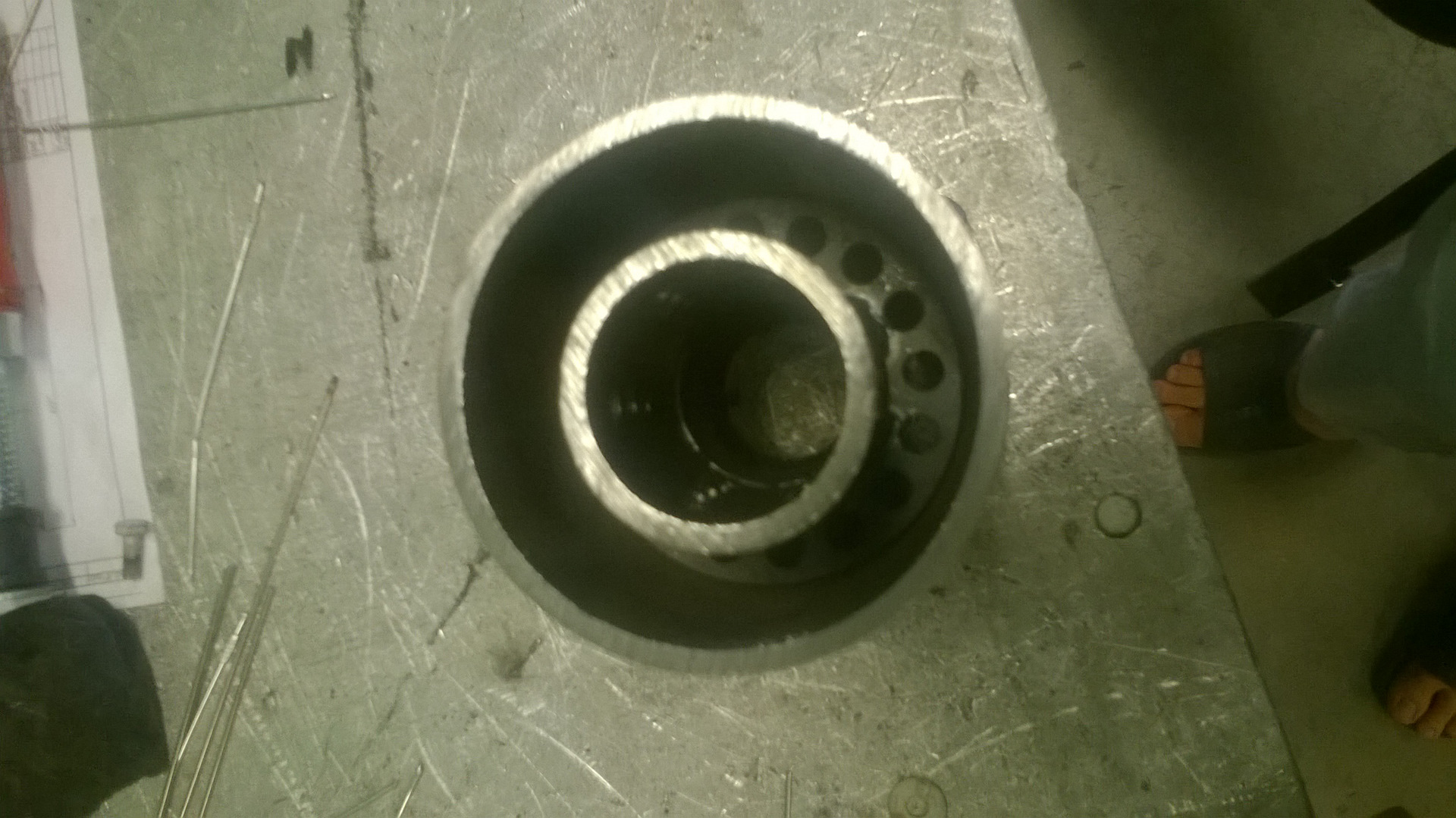 Большая труба должна быть на 30-40 мм больше в диаметре. После того, как по окружности малой трубы будут проделаны отверстия, ее необходимо зачистить щеткой по металлу и вставить в большую трубу (строго посредине).