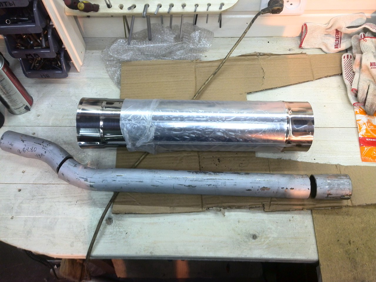 - берете трубу диаметром, подходящим к трубам глушителя, делаете ее длину равную длине банки глушителя или немного больше для облегчения сварочных работ;