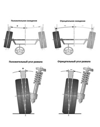Углы наклона колесПоясняем. Если между условно обозначенными задними точками колес промежуток больше, чем между передними, и кажется, что колеса в паре вывернуты «внутрь», то схождение положительное. А если они как будто «смотрят» в стороны, то оно будет называться отрицательным.