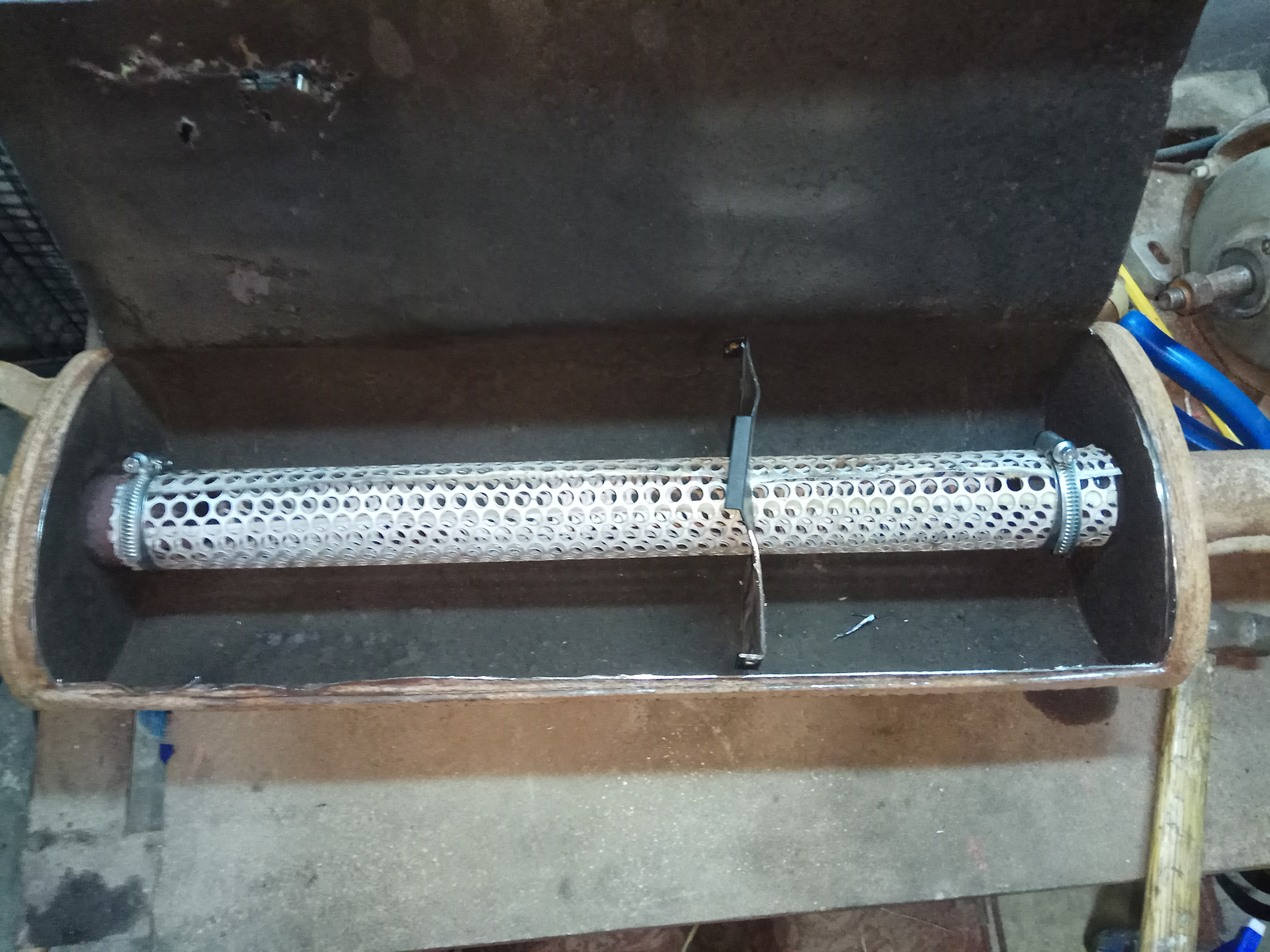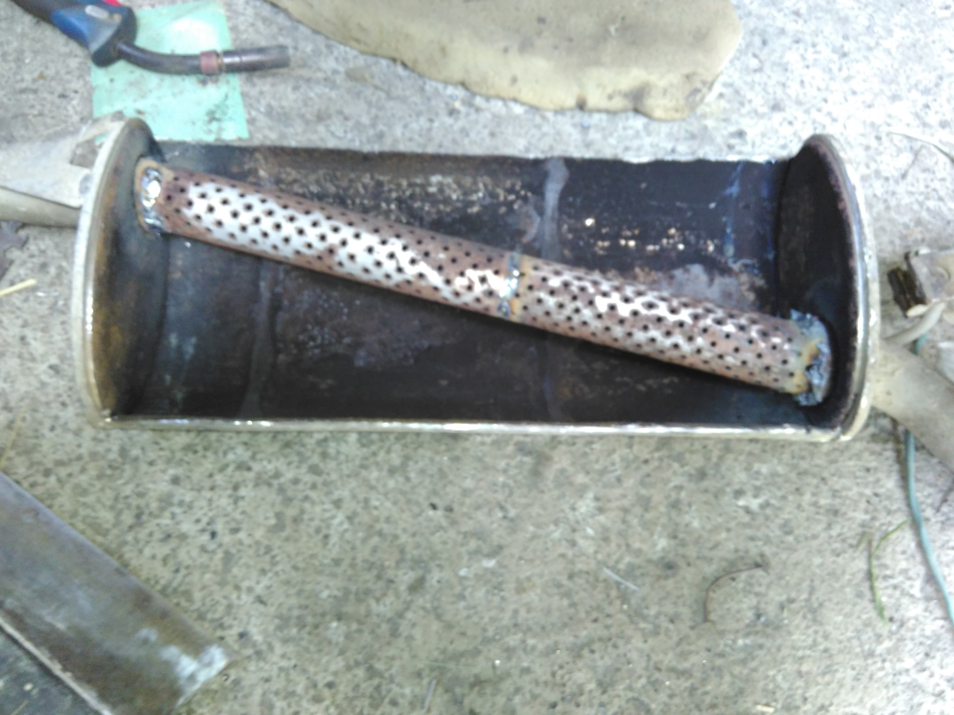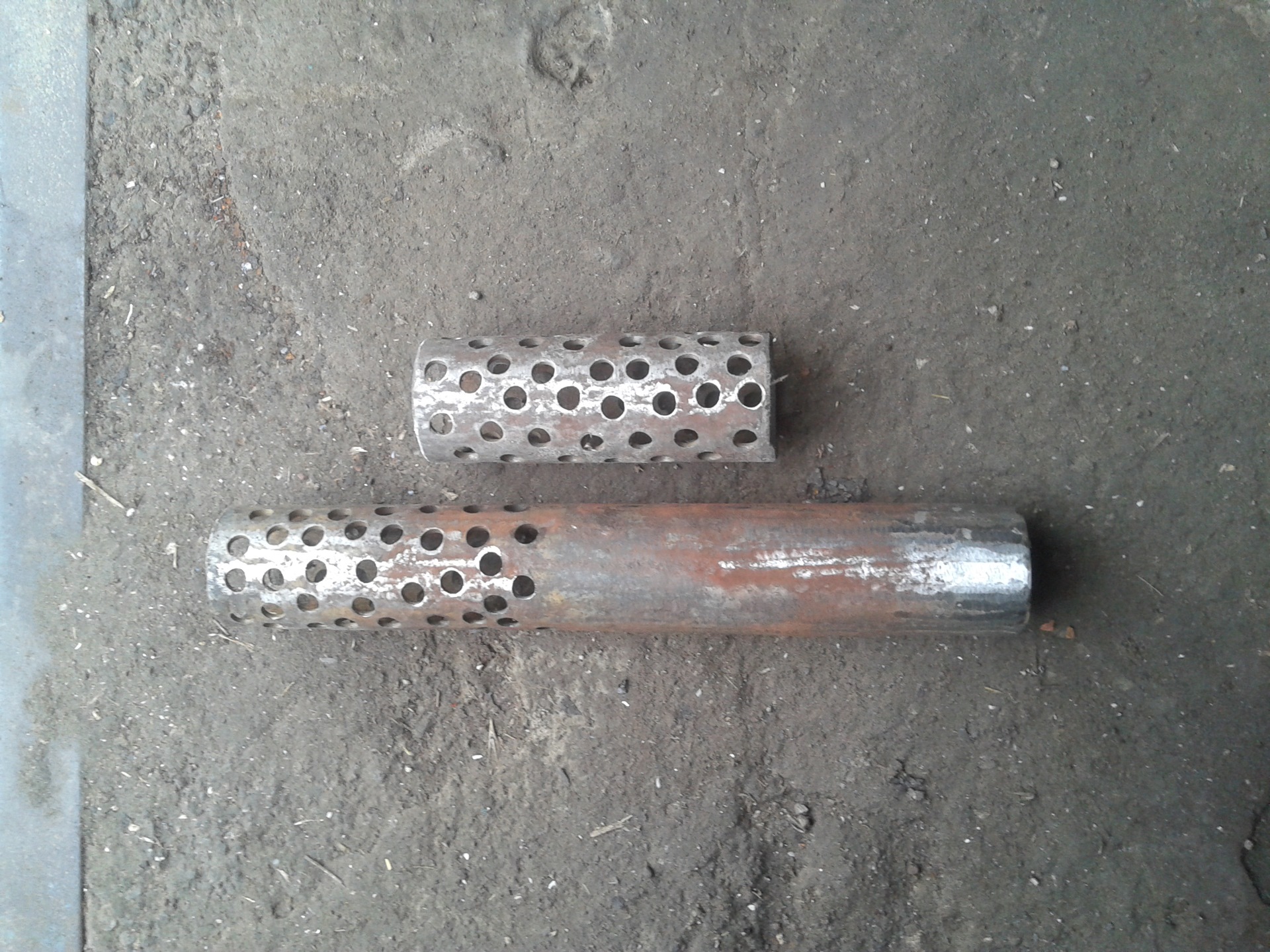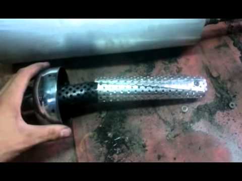 Начать изготовление необходимо с изъятия всех внутренностей глушителя. После этого берем трубу, совпадающую диаметром с трубой глушителя, в месте, где она будет входить в глушитель проделываем отверстия, и привариваем к ней вторую трубу большего диаметра, вставляем в старый корпус и с обеих сторон завариваем.