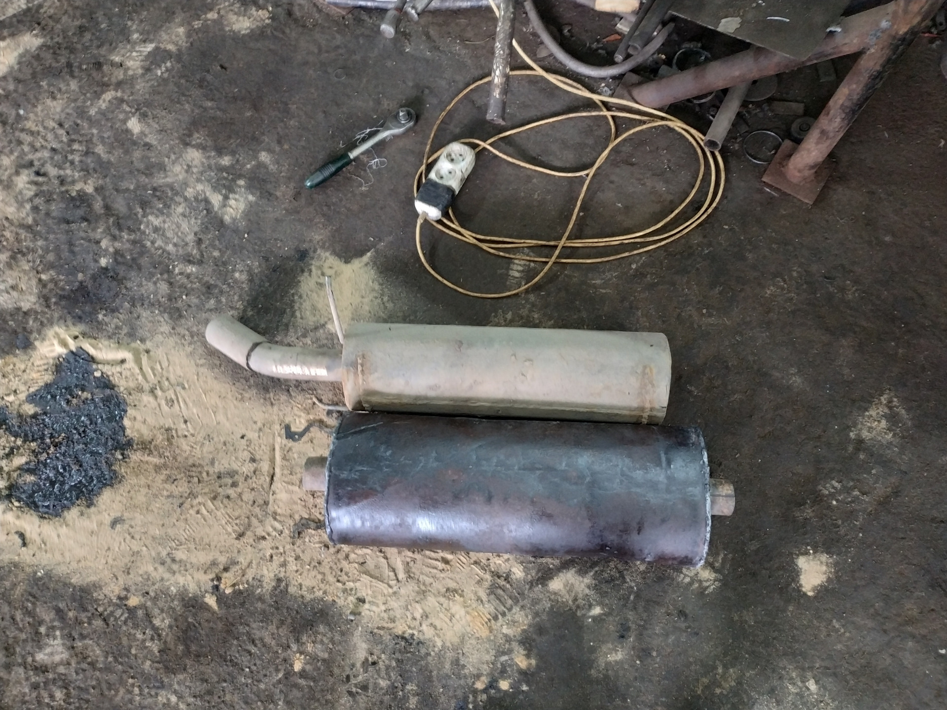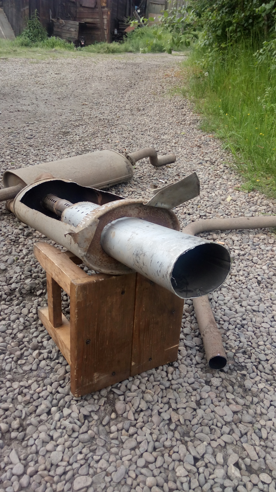 Вскрыв корпус глушителя, следует убрать имеющееся в нем изолирующее наполнение. Прежнюю трубу понадобится соединить посредством сварки с новой, примерным диаметром 20 см. Если вы сделали все правильно, внешне получившаяся конструкция практически не будет отличаться от демонтированной, — иначе ее не удастся закрепить на днище.