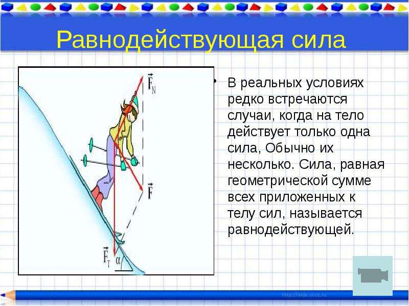 Сила — это всякое притяжение или отталкивание тел. Беря тело в руки, мы прикладываем к нему силу. А если оно остается в покое, на него все равно действуют силы, только они уравновешивают друг друга. Под действием сил тела движутся быстрее или медленнее, останавливаются, меняют направление движения, а также меняют свою форму и размеры.