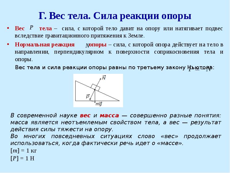 Вес тела — это сила, с которой предмет воздействует на опору. Вы скажете, так это же сила тяжести! Путаница происходит в следующем: действительно часто вес тела равен силе тяжести, но это силы совершенно разные.