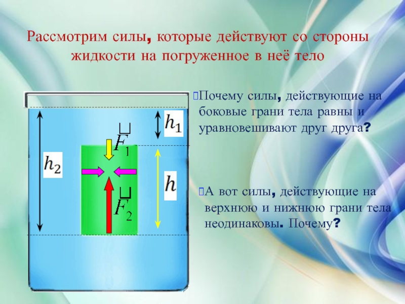 Сила возникает в результате взаимодействия тела с жидкость (газом), при его погружении в жидкость (или газ). Эта сила выталкивает тело из воды (газа). Поэтому направлена вертикально вверх (выталкивает). Определяется по формуле: