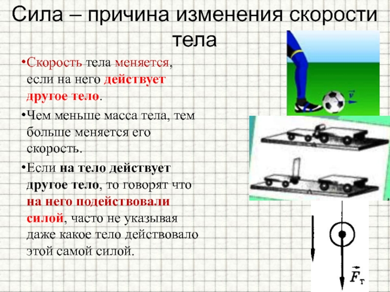 При ударе по футбольному мячу сила удара приводит мяч в движение. Когда вратарь ловит мяч, сила толчка со стороны рук заставляет мяч остановиться. Если надавить на мяч ногой, то он сплющивается под действием двух равных, но противоположно направленных сил — давление ноги и давление земной поверхности.