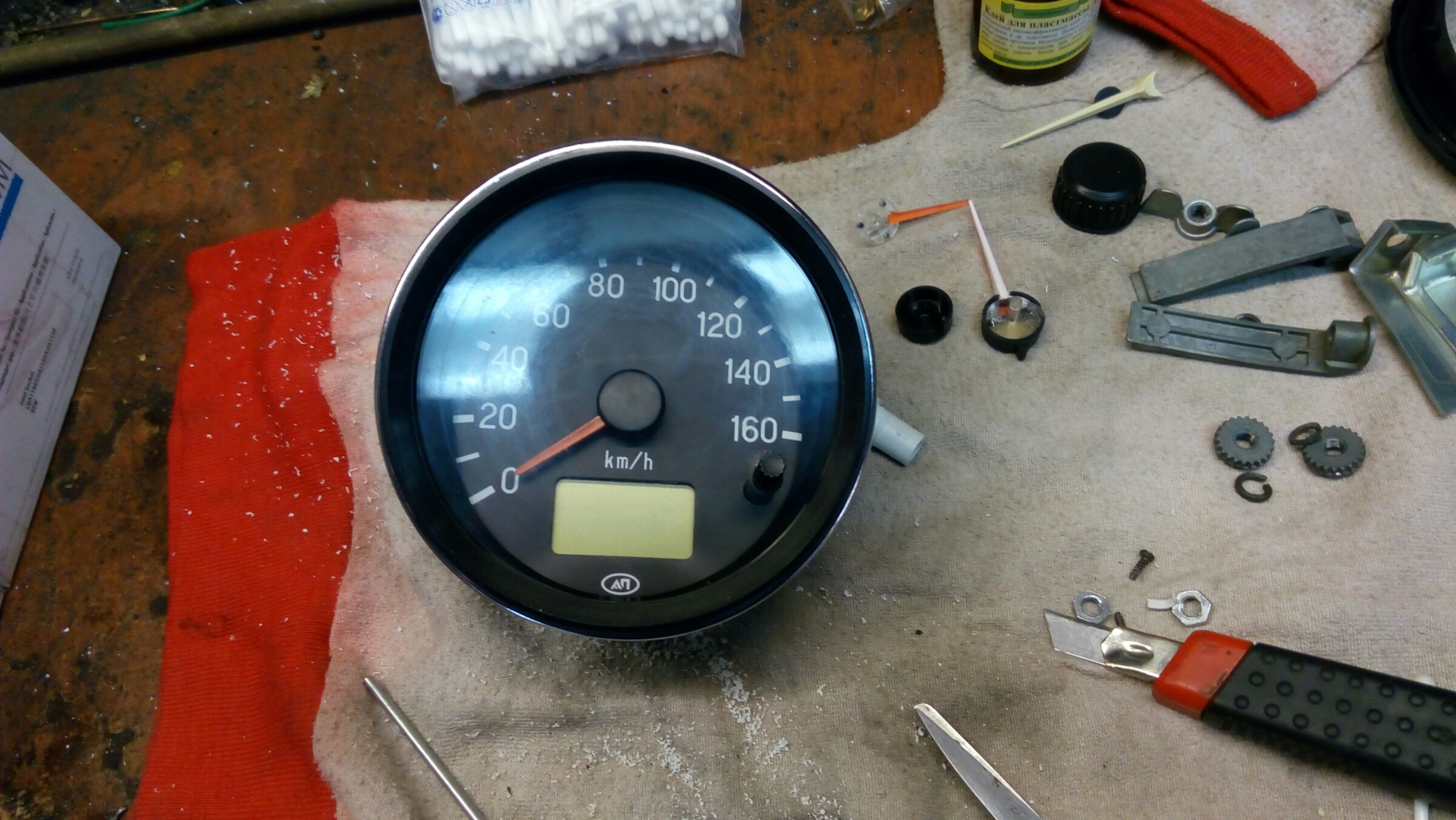 Хотя, некоторые модели спидометров позволяют скрутить их назад без разборки, достаточно вынуть приводной тросик из коробки передач и закрепив его на валу электродвигателя, крутить его в нужную сторону, подключив моторчик в нужной полярности.