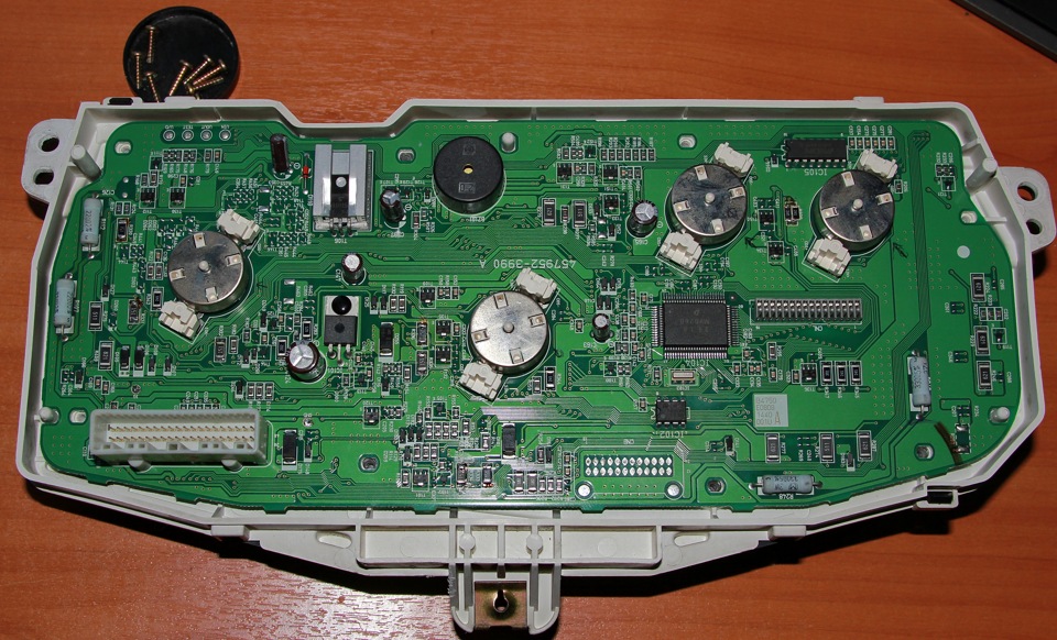 В плате установлена небольшая микросхема (всего 8 ножек, см. фото cлева) с памятью всего в 1 килобайт, которой хватает для сохранения информационных параметров приборной панели. Для стирания (скручивания) показаний реального пробега, следует выпаять микросхему и подключив её к компу, изменить показания. Но чтобы выпаять микросхему, придётся разобрать приборку, чтобы добраться до обратной стороны платы.
