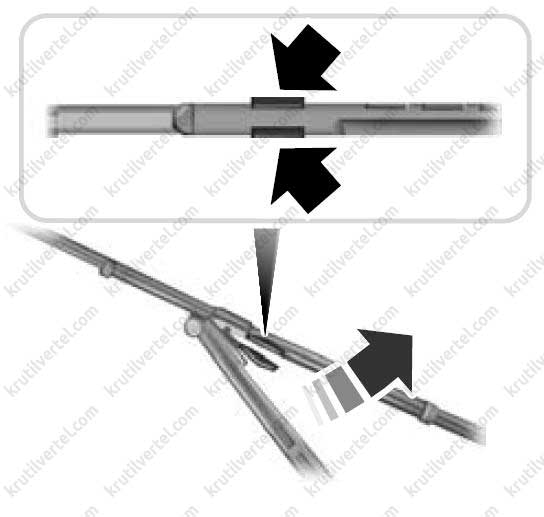 Защелкивание в пазах – отгибаете до рабочей высоты поводок (рычаг) от лобового стекла. Щетку поворачивайте перпендикулярно к поводку и вы увидите на соединителе механизмы типа защелки. Чтобы ослабить крепление, удерживающее шарнир щетки в пазах защелки, необходимо немного нажать или приподнять саму защелку. Теперь можно достать старую испорченную щетку. Она проталкивается по пазам вперед. Новая вставляется на место старой. Ее нужно толкать по пазу до тех пор, пока она не войдет полностью и пока не сработает защелка.