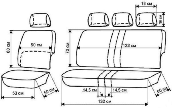 При формировании выкройки и сшиве ее воедино, требуется соблюдать конструкционные особенности заднего дивана. Он может иметь подлокотник посредине. Нужно позаботиться о том, чтобы новые чехлы не снижали удобства авто и позволяли пользоваться всеми преимуществами конструкции.