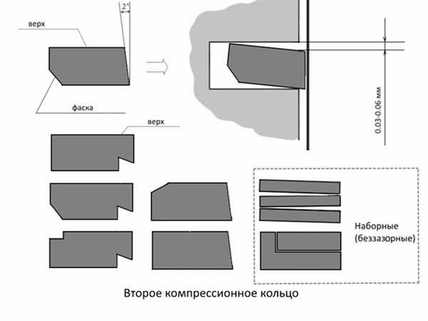 После этого надевают компрессионные кольца. Они должны быть установлены в верхние канавки. Не рекомендуется для установки применять какой-либо сторонний инструмент. Следует помнить, что кольца очень хрупкие и легко ломаются. Если компрессионные детали разные, то одном обычно закругленной формы, а второе — в форме трапеции. Закругленное ставят в верхнюю канавку, а трапецеидальное – ниже. Скос должен расширяться сверху-вниз. Внизу канавки кольцо должно быть более широким, чем в верхней части.