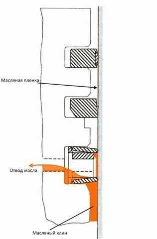 При движении поршня вниз маслосъемные кольца соскребают со стенок цилиндра излишки масла направляя их по дренажным отверстиям в поршне обратно в картер. Масляный клин перед кольцом помогает эффективно смазывать скользящую юбку поршня. Стенки цилиндра имеют шероховатость, так называемый хон, который позволяет задерживать тончайший слой масла, для компрессионных колец.