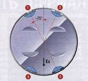 У состоящих из трёх частей колец правильное положение пружины-расширителя является обязательным для выполнения функции удаления масляной плёнки (рис. 1 и 2). В любом случае перед монтажом проверьте также у поршня с уже вставленными кольцами положение пружины-расширителя. Во время транспортировки концы пружины находятся в ненатянутом состоянии и могут находить друг на друга. Обе цветных маркировки на концах пружины должны быть видны (рис. 3). Если они не видны, то концы пружины перекрываются внахлёстку и кольцо не функционирует. Все стыки маслосъёмного поршневого кольца, состоящего из трёх частей (обе стальные пластины и пружина-расширитель), должны вставляться смещёнными на 120° по отношению друг к другу.