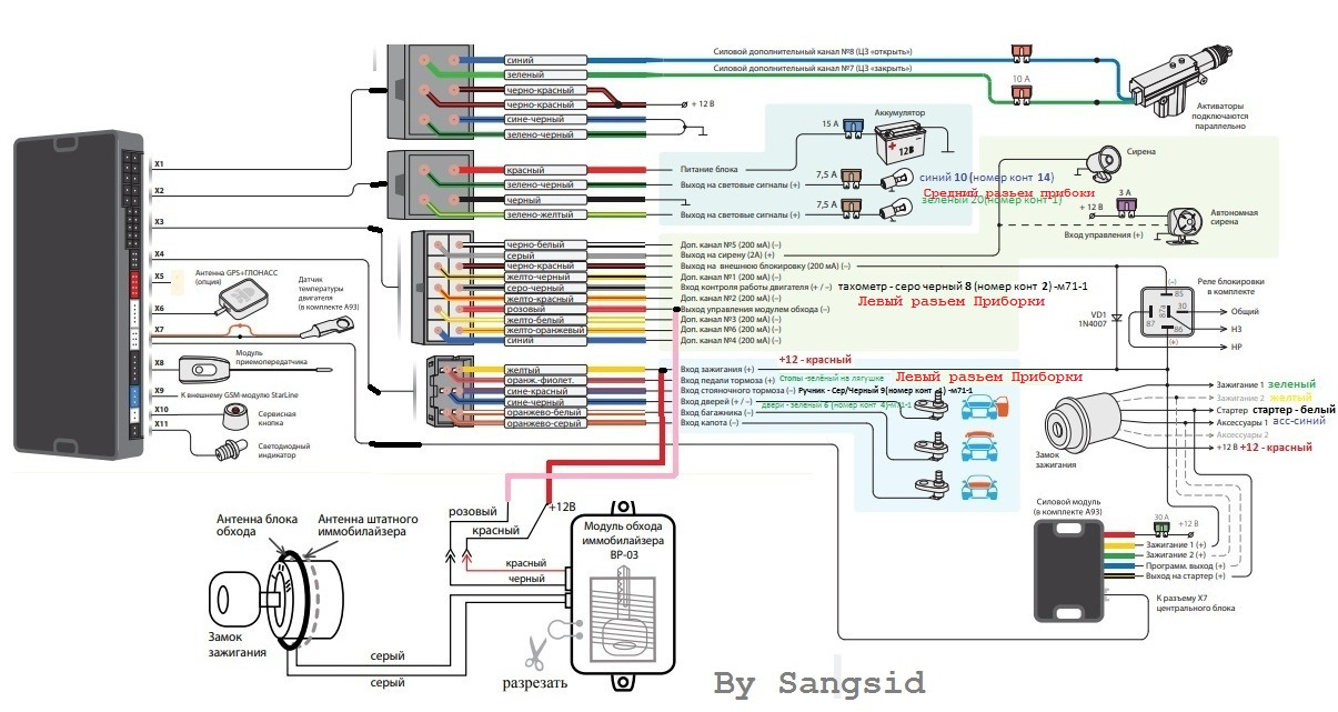 Подключение сирены, датчиков и других проводов согласно схемы также не должно составить особых проблем.