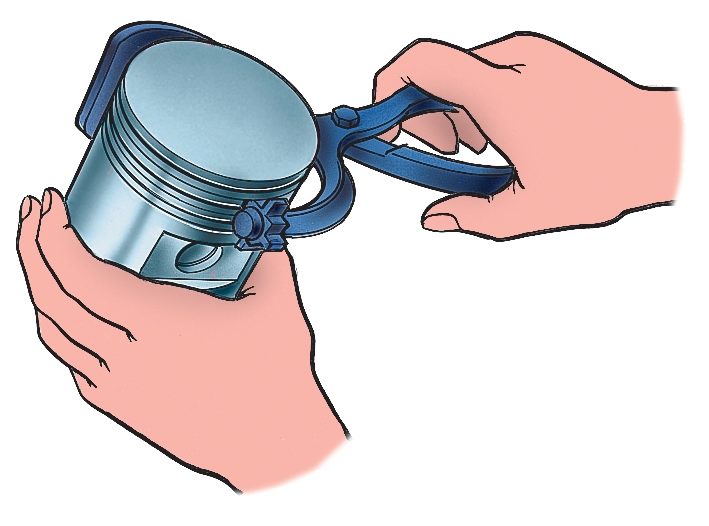 — вставить поршень в отверстие цилиндра, пока кольца поочередно не войдут в канал, а нижняя головка шатуна не сядет на шатунную шейку коленчатого вала;