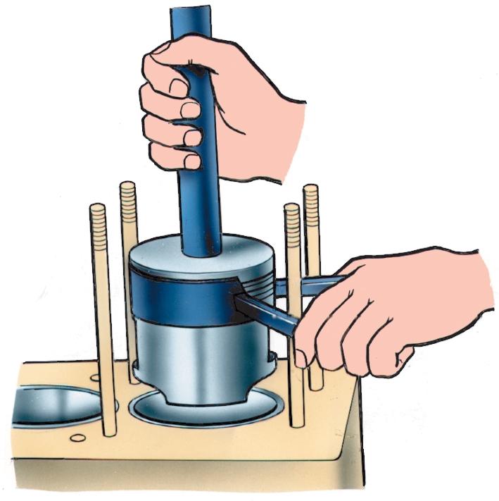 Это можно сделать двумя способами, в зависимости от пилы и доступного рабочего пространства. Некоторые пилы очень трудно поставить руками в правильное положение, чтобы надавить на пружины и передвинуть цилиндр. На этих пилах поршень и кольца слегка вставляются в цилиндр, а поршневой палец немного в поршень. Затем вы можете надеть этот узел на шатун и вставить поршневой палец. Только не забудьте цирк клип.