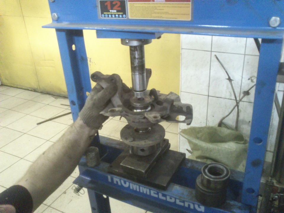 Второе извлеките аналогичным способом. - Теперь с обратной стороны установите наставку, которая будет выдавливать подшипник. Демонтируйте его со поворотного кулака переднего колеса.