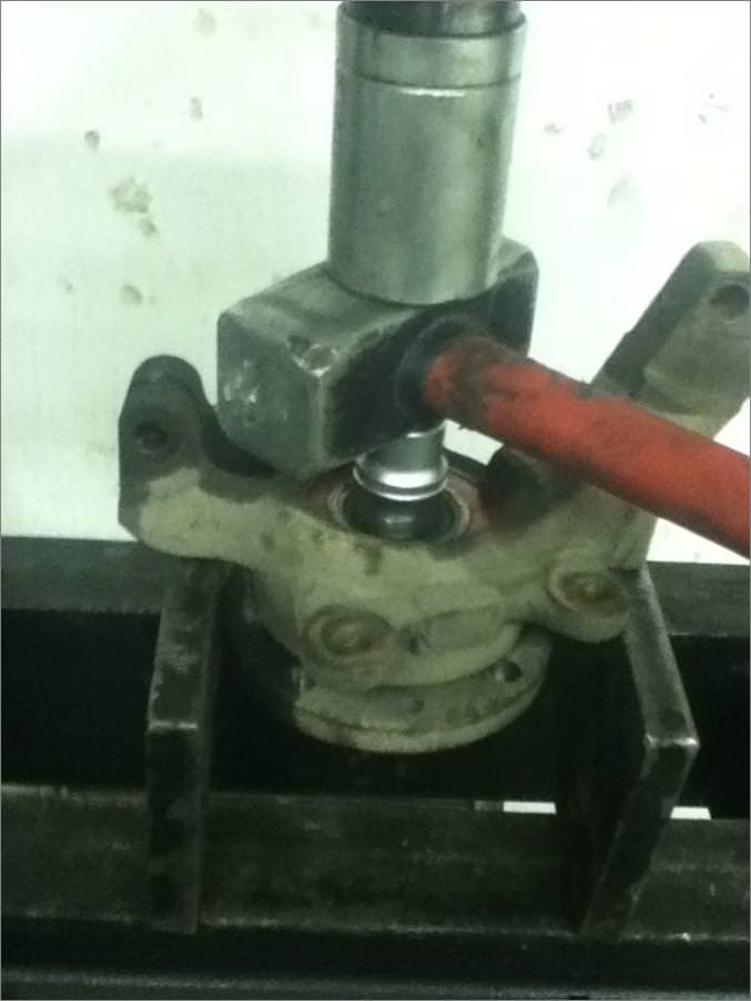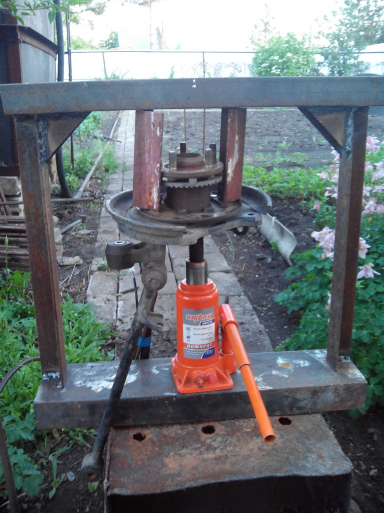 В качестве силы, вдавливающей и извлекающей подшипник, можно использовать гидравлический бутылочный домкрат. Для успешной выпрессовки нужна оправка, диаметр которой будет больше внешнего диаметра ступицы. Один край оправки будет упираться в поворотный кулак, а второй в плоскость, толкаемой домкратом. Другая наставка будет использоваться для выдавливания. Ее диаметр должен соответствовать внешнему диаметру подшипника либо быть на 1-2 мм меньше.