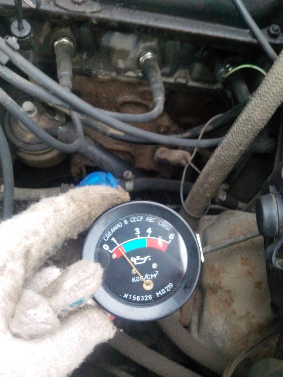 Заводим мотор, убеждаемся, что масло ни откуда не течёт, и смотрим на показания манометра. Правильно смотреть давление масла на прогретом моторе, потому, что холодное масло всегда гуще и будет давать большее давление, чем горячее.