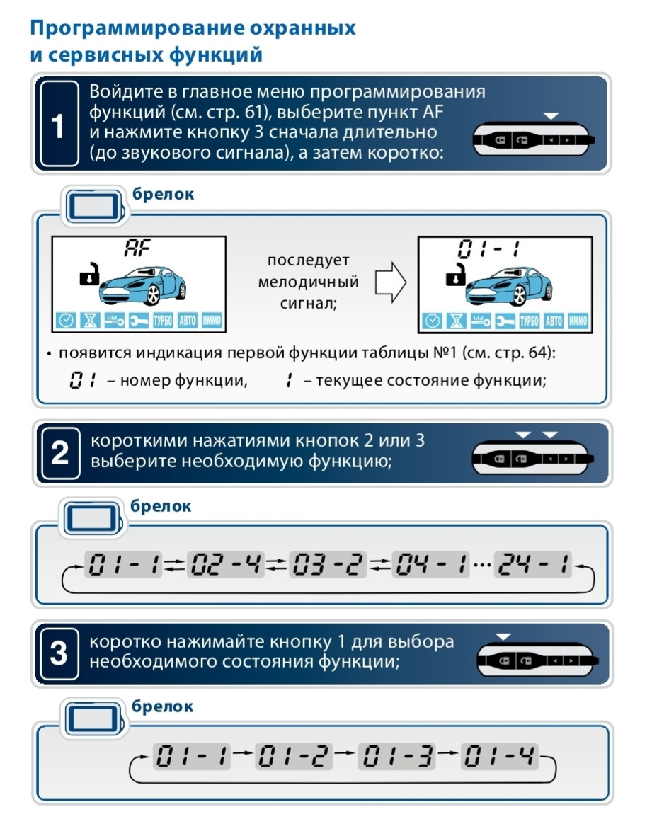 - продолжительное – кнопка фиксируется водителем до появления звуковых сигналов от брелока;