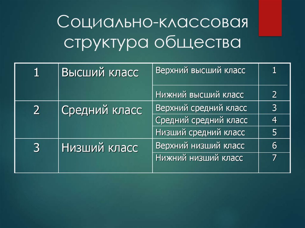 Наконец, самое низкое положение в иерархии социальных классов — это низший класс — низший-низший класс. Здесь формируются нормы и ценности, которые обычно резко отличаются от остального общества.Низшие слои населения характеризуются крайней бедностью, безработицей, бездомностью, преступностью, насилием и так далее.