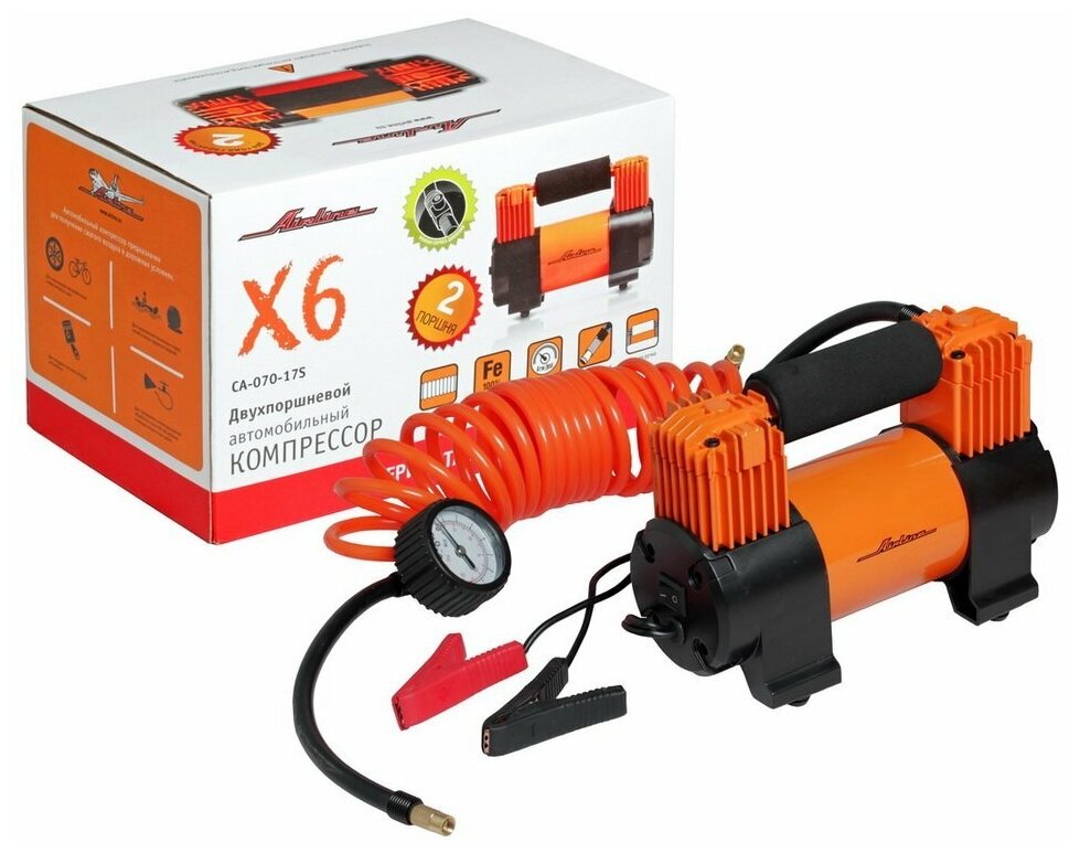 Самый маленький из линейки автомобильных компрессоров Агрессор, но его вполне хватит для накачки колес малолитражного автомобиля. Длина кабеля 3м, а длина шланга 1м, что тоже вполне достаточно для небольшого автомобиля. Питание осуществляется от прикуривателя. В комплекте идут переходники для накачки мячей, матрацев и велосипедных колес.