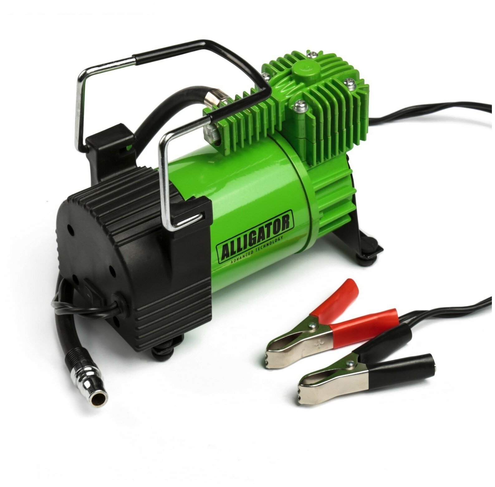 Эта модель питается только от аккумулятора посредством специальных зажимов, так как мощность уже не рассчитана на прикуриватель. Длинна шланга, как и у предыдущей модели составляет 5м. Добавляются переходники для накачки всех видов резиновых лодок.