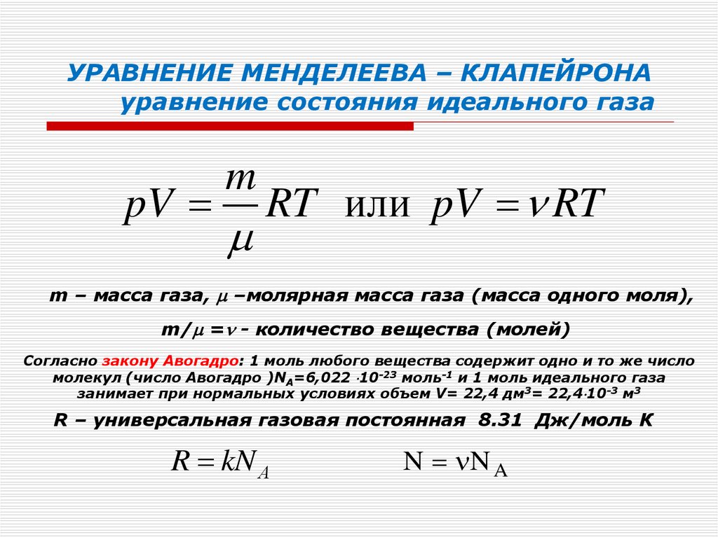 Это представляет собой уравнение состояния (УРС) идеального газа. Числовые значения «R» зависят от используемой системы единиц: R10.731psia ft3lbmol R8.3144Joulegmole K1.9872calgmole K Это уравнение не отображается должным образом из-за несовместимого браузера. Список совместимых браузеров см. В разделе «Технические требования» в разделе «Ориентация».Список совместимых браузеров см. В разделе «Технические требования в ориентации». Если мы построим диаграмму P-v для идеального газа при заданной температуре, мы получим изотерму, показанную на рисунке 6.2. Рисунок 6.2: Изотерма P-v для идеального газа Модель идеального газа предсказывает два ограничивающих поведения жидкости: во-первых, объем газа становится очень большим при очень низких давлениях v → ∞. Это уравнение не отображается должным образом из-за несовместимого браузера. Список совместимых браузеров см. В разделе «Технические требования в ориентации».as P → 0 Это уравнение не отображается должным образом из-за несовместимого браузера. Список совместимых браузеров см. В разделе «Технические требования в ориентации». , концепция, которая согласуется с тем, что мы знаем из нашего опыта в физическом мире). Во-вторых, v → ∞ Это уравнение не отображается должным образом из-за несовместимого браузера. Список совместимых браузеров см. В разделе «Технические требования в ориентации». as P → 0 Это уравнение не отображается должным образом из-за несовместимого браузера. Список совместимых браузеров см. В разделе «Технические требования в ориентации».(объем материи просто «исчезает», если давление достаточно велико: эту концепцию мы не были бы так готовы принять). Эти два поведения являются следствием предположений, сделанных в модели идеального газа. Идеальный газ определяется как жидкость, в которой объем молекул газа незначителен по сравнению с объемом, занимаемым газом. Считается, что такие идеальные газы подчиняются закону Бойля, закону Чарльза и закону идеального газа или уравнению идеального газа.Сначала мы обсуждаем идеальные газы, а затем реальные газы. Если M представляет собой молекулярную массу газа, а масса определенного количества газа составляет m , количество молей n определяется как (1,27) n = mM , где n — это число, которое представляет количество молей в данной массе. Например, молекулярная масса метана составляет 16,043. Следовательно, 50 фунтов метана будут содержать примерно 3 моля. Закон идеального газа, также называемый уравнением идеального газа, гласит, что давление, объем и температура газа связаны с числом молей следующим уравнением: (1.28) PV = nRT , где в единицах USCS P — Абсолютное давление, фунты на квадратный дюйм, абсолютное (psia) V — Объем газа, футы 3 n — Количество фунт-моль, как определено в уравнении. (1,27) R — Универсальная газовая постоянная, psia ft 3 / фунт · моль · ° R T — Абсолютная температура газа, ° R (° F + 460) Универсальная газовая постоянная R имеет значение 10.73 фунт / дюйм2 фут 3 / фунт · моль · ° R в единицах USCS. В единицах СИ уравнение идеального газа выглядит следующим образом: (1,29) PV = nRT , где P — Абсолютное давление, кПа V — Объем газа, м 3 n — Количество моль в кг, как определено в уравнении. (1,27) R — Универсальная газовая постоянная, кПа · м 3 / кг · моль · K T — Абсолютная температура газа, К (° C + 273) Универсальная газовая постоянная R имеет значение 8.314 Дж / моль · К в единицах СИ. Мы можем комбинироват
