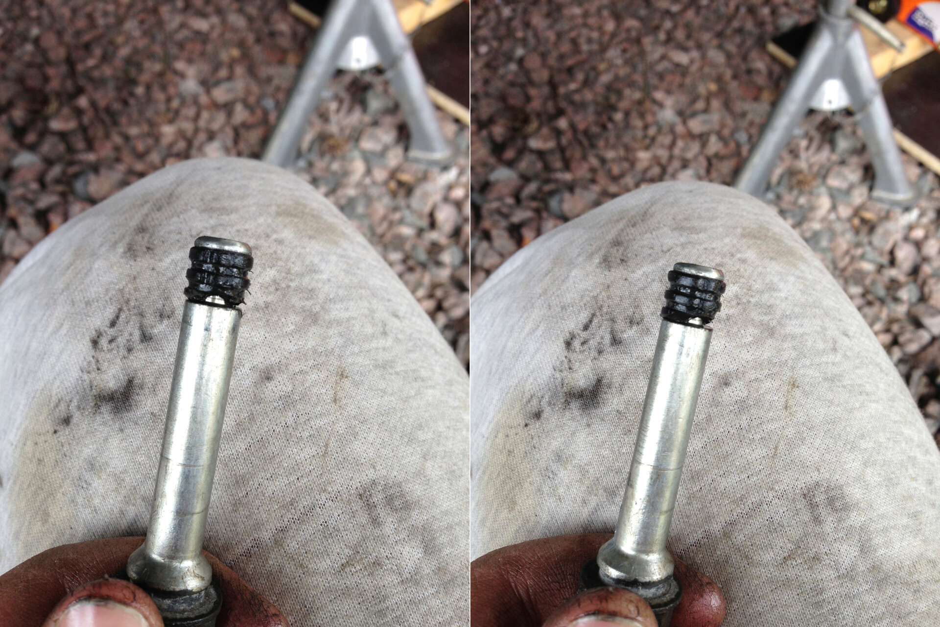 Если тормоза затягиваются и причиной являются скользящие штифты, они могут застрять, и для их удаления требуется покачивание / скручивание / дополнительное усилие. После снятия верхний штифт выглядит так: