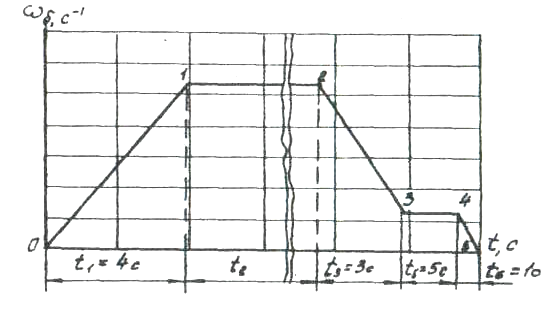 Учитывая, что время пуска электродвигателя tn = 4 с, время торможения tr = = 3 с, время движения люльки с «ползучей» скоростью tmin = 5 с, определив время движения люльки с установившейся скоростью, построить график зависимости угловой скорости барабана от времени (рис.8). Используя вышеуказанный график, построить график зависимости угла поворота барабана от времени (рис.9).