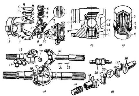 а—в — неравных угловых скоростей; г и д — равных угловых скоростей; 1, 2, 24 и 28— вилки; 2— карданный вал; 3— крышка; 4— стопорная пластина; 5— стакан подшипника; 6— иголки; 7— войлочные уплотнения; 8— масленка; 9— крестовина; 10 — предохранительный клапан; 12 — отражатель; 13 — самоподжимная уплотнительная манжета; 14 — стопорное кольцо; 15 и 16 — радиальные и торцевые уплотнительные манжеты; 17— ведущие шарики; 18— наружный кулак; 19— центральный шарик; 20— внутренний кулак; 21 — штифт; 22— шпилька; 23— полуось; 25 и 27— полуцилиндрические кулаки; 26 — центральный диск.