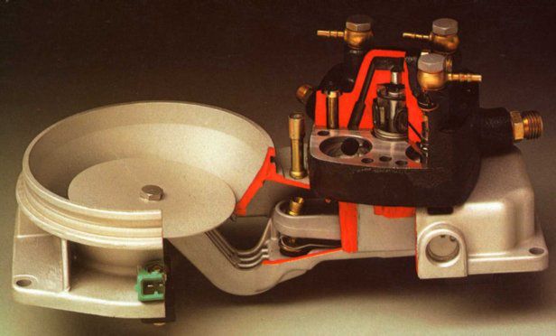 Дозатор — главный узел системы. Именно от того, что происходит в дозаторе, в конечном итоге зависит работа двигателя. Дозирование в KE-Jetronic реализуется по принципу баланса давлений топлива в разделенных гибкой мембраной верхней и нижней камерах дифференциальных клапанов дозатора. Сколько в двигателе цилиндров, столько в дозаторе дифференциальных клапанов. Другими словами, каждый клапан обслуживает соответствующую форсунку впрыска, определяя расход топлива через нее.