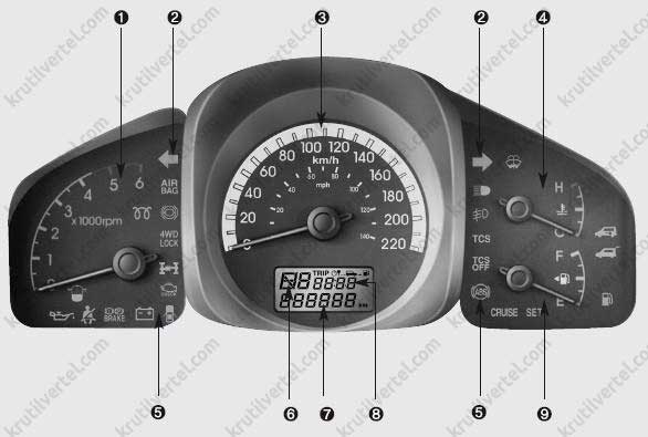 1 – тахометр; 2 – спидометр; 3 – указатель уровня топлива; 4 – ЖК-дисплей; 5 – контрольные и индикаторные лампыТахометр