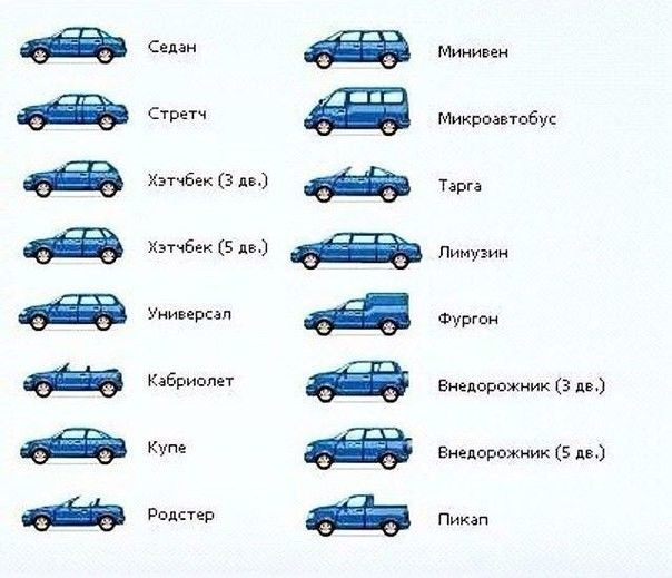 По типу кузова все авто можно условно разделить на открытые и закрытые. Наиболее привычная и знакомая для нас классификация закрытых: