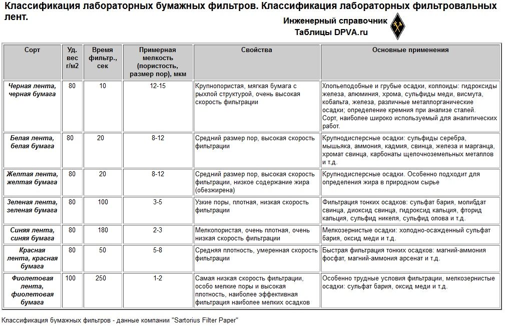 | Классы фильтрации в соответствии с