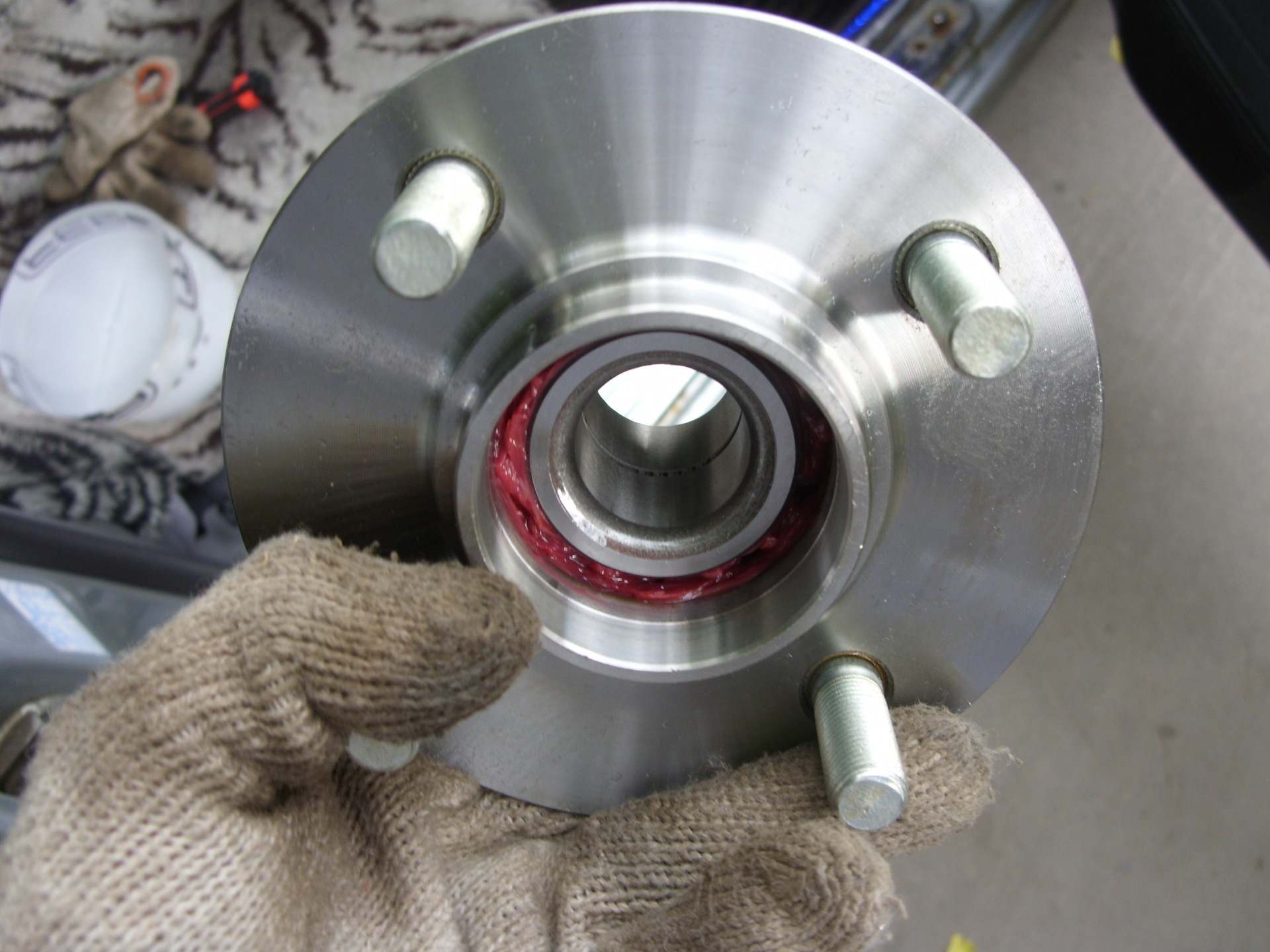 5. Всё снято, теперь нужно всё установить обратно, но только все старые детали будут поменяны на новые, так вот прежде чем всё устанавливать, промойте все детали в керосине или же в уайт-спирите и на посадочные места подшипников ступицы, нанесите пластичную смазку которая скорее всего будет прилагаться в коробочке в которой был приобретён ступичный подшипник и приступайте к сборке, первыми установки подлежат кольца подшипников, их нужно сажать до самого упора и главное устанавливайте их на те же места где они и стоять должны (см.