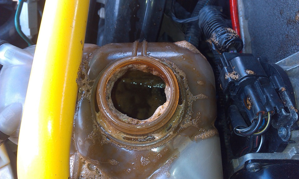 Состояние антифриза можно определить и визуально. Если ОЖ помутнела или побелела (потеряла цвет), это первый признак того, что она теряет свои свойства. Если антифриз стал коричневым (грязным), это означает, что в нем присутствуют частицы ржавчины, тянуть с заменой нельзя. Когда в расширительном бачке появляется пена, а его дно покрывается слоем твердых частиц, то тянуть больше с заменой нельзя, ОЖ надо срочно менять, причем с обязательной промывкой.