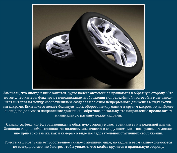 Все дело в стробоскопическом эффекте. И да, это ни что иное, как оптический обман зрения, возникающий при искаженном восприятии движущихся предметов: в нашем случае — колес автомобиля, а точнее — спиц колесного диска. Обусловлен он как «мерцающим» освещением, так и рядом биологических факторов, в частности, строением зрительной системы человека.