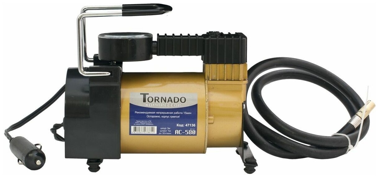 Подключается прибор в розетку прикуривателя, что говорит о невысокой его мощности. Имеет встроенную защиту от перегрева, удобную рукоятку для транспортировки, а также удлиненный гибкий шланг на 68 см. Фонариком можно не только подсветить колесо, но еще и обозначить прибор на дороге, когда, к примеру, приходится подкачивать колесо ночью на обочине. Резиновые ножки снижают вибрацию, а в верхней части инструмента расположен манометр. Единственный недостаток, который был выявлен пользователями — это необходимость дополнительной подсветки манометра, чтобы прочитать показания.
