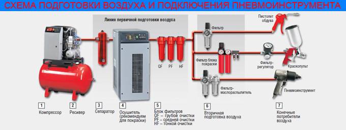 Выбирая воздушный компрессор для покраски, учитывайте, что требуется подготовить воздух. Данный нюанс очень важен, поскольку если пропустить этот шаг, то атмосферный воздух после сжатия и подачи в пневмомагистраль будет насыщен всевозможными включениями.