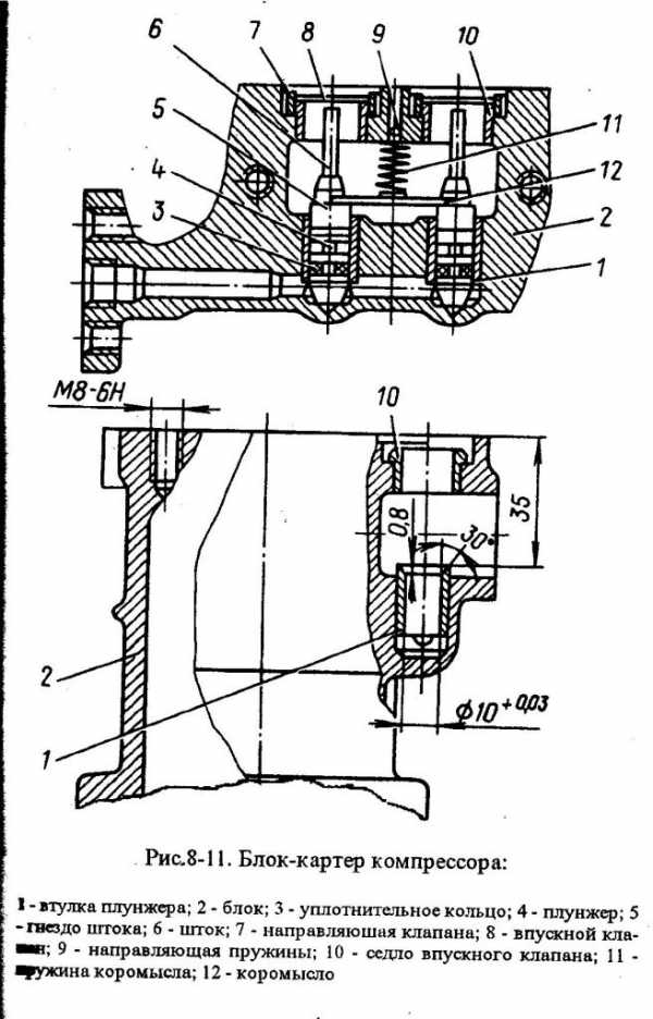 Блок-картер. В процессе эксплуатации на картере компрессора могут появиться трещины и сколы. При наличии трещин на стенках Картера его следует заменить. Небольшие трещины на фланце крепления картера к двигателю, захватывающие не более одного отверстия под болт крепления, допускается заваривать или наплавлять.